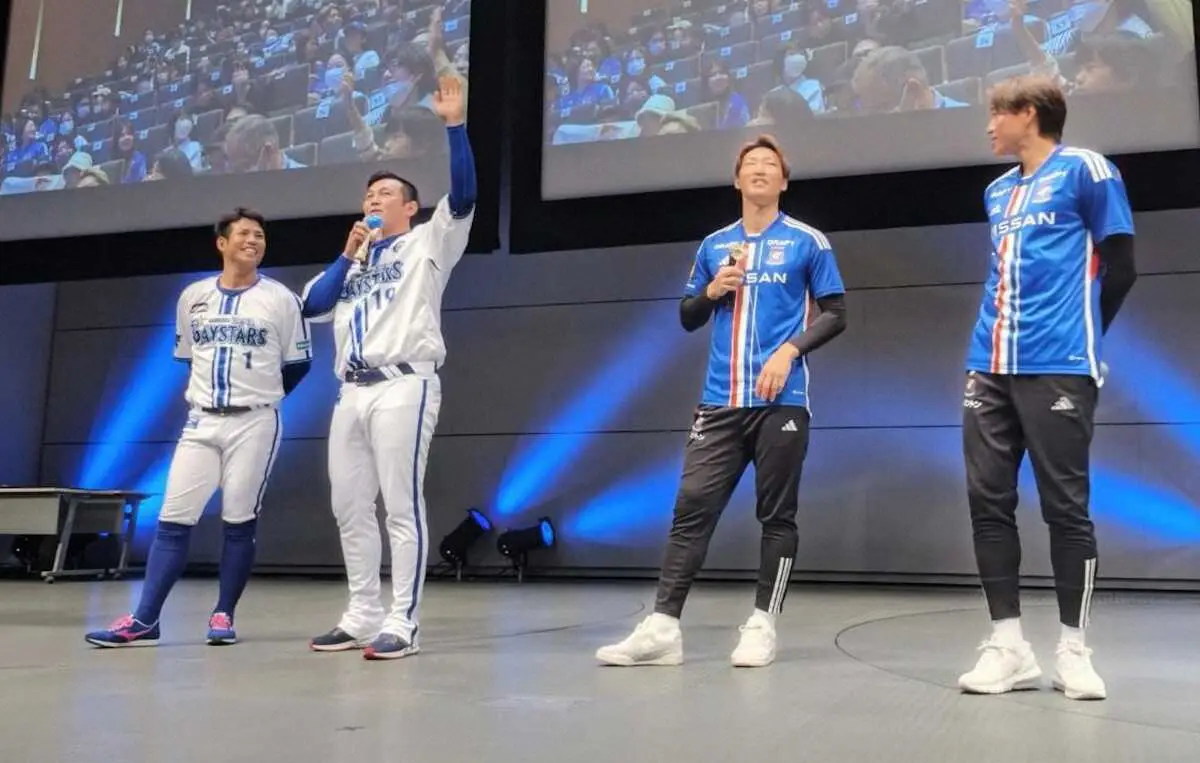 横浜のDF松原とDF畠中が横浜市内で行われた「横浜DeNAベイスターズ&横浜F・マリノススペシャルトークショー」にDeNAの山崎、桑原とともに参加。