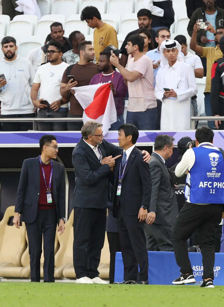 <アジア杯 日本・ベトナム>試合後、森保監督(右)はトルシエ監督と話す(撮影・西海健太郎)
