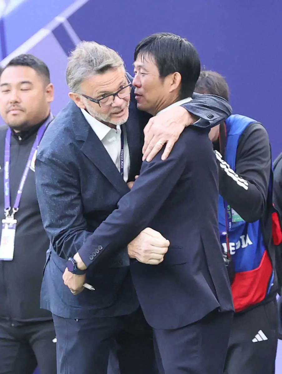 <日本・ベトナム>試合前に話をした森保監督(右)とトルシエ監督(撮影・西海 健太郎)