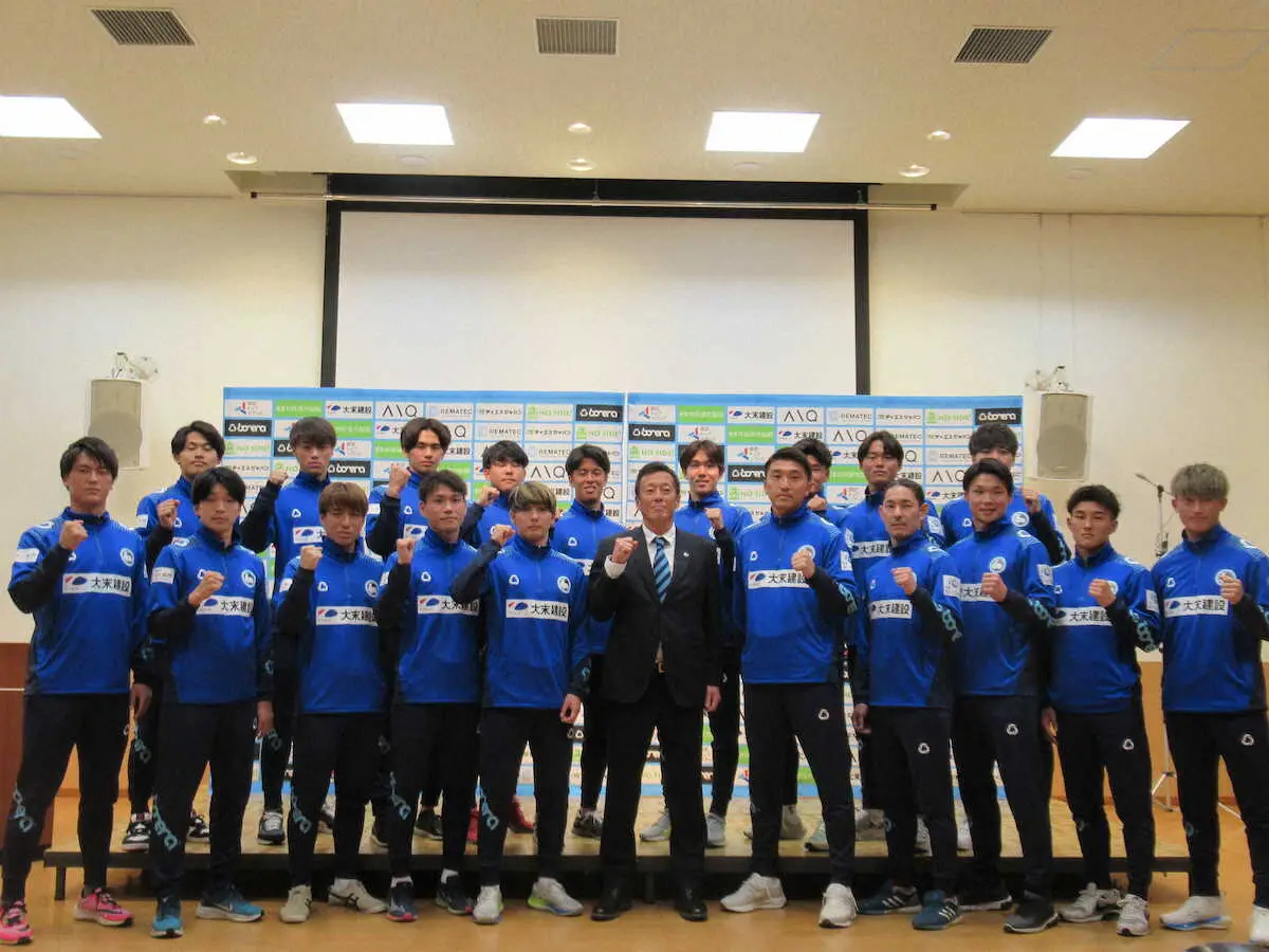 FW武颯ら数選手は所用で不在だったが、復帰組を含めて新加入選手は総勢24名。大嶽直人新監督を中心に19選手がひな壇に並んだ際にはサポーターから「これで1チームできあがるやん」と鋭いツッコミが入った。