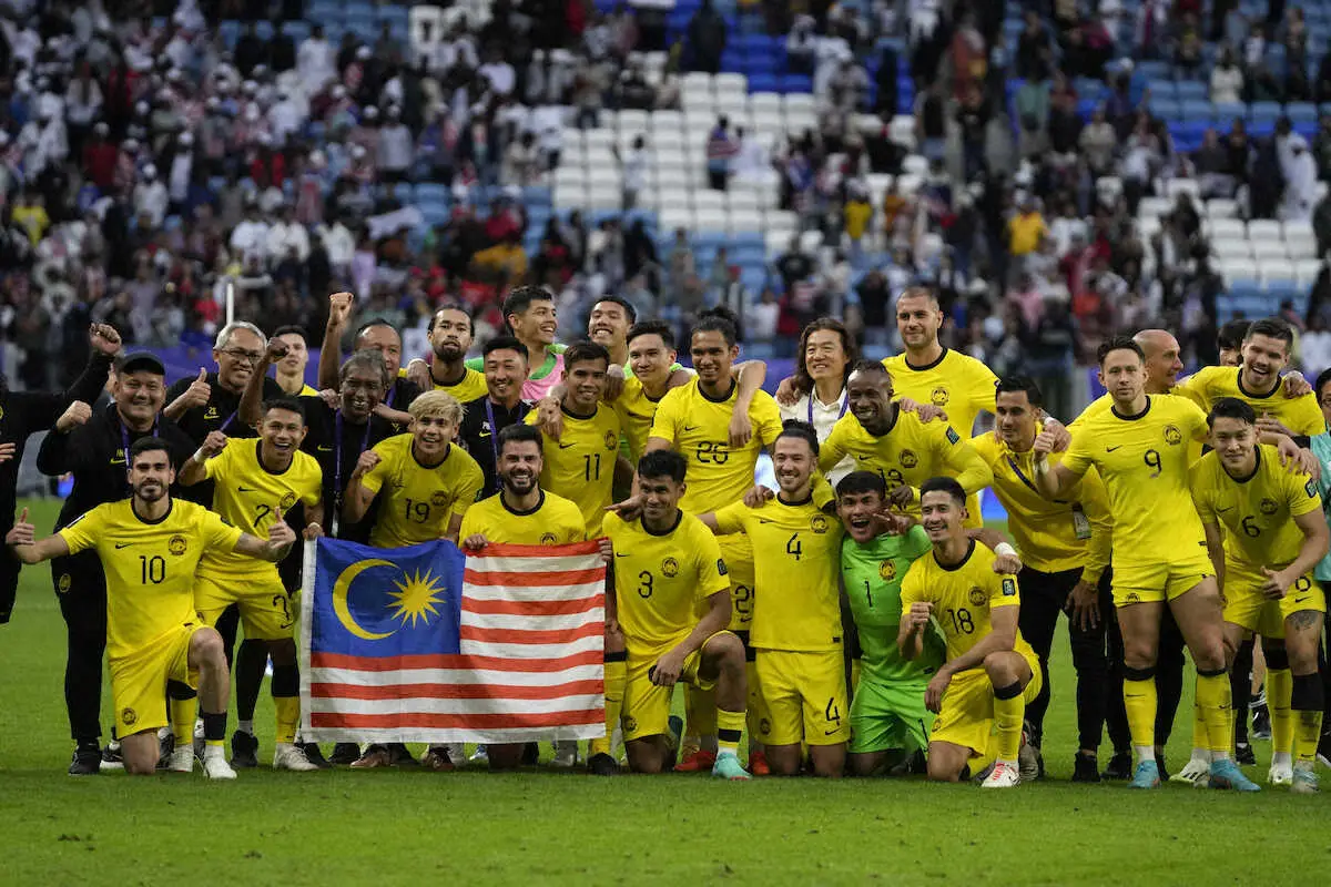 カタールで開催中のサッカー・アジア杯は25日、1次リーグE組の2試合が行われ、マレーシア代表(世界ランク130位)が韓国代表(同23位)と3―3の引き分け。世界ランキングで100位以上も差のある“格上”から勝ち点1を獲得すると、選手もサポーターも大盛り上がり。すでに1次リーグ最下位で敗退が決まっていたが試合後には笑顔で記念撮影する場面もあった。