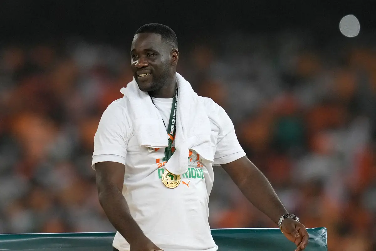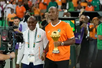 <アフリカ杯決勝 ナイジェリア・コートジボワール>試合前、優勝トロフィーを持ち入場した元コートジボワール代表ドログバ氏(右)(AP) Photo by AP ドログバ氏 母国のアフリカ杯制覇に歓喜!駆け寄るイレブンとの抱擁がネッ… ギャラリーで見る この記事のフォト 2024年02月12日の画像一覧 もっと見る 2024年02月12日の画像をもっと見る