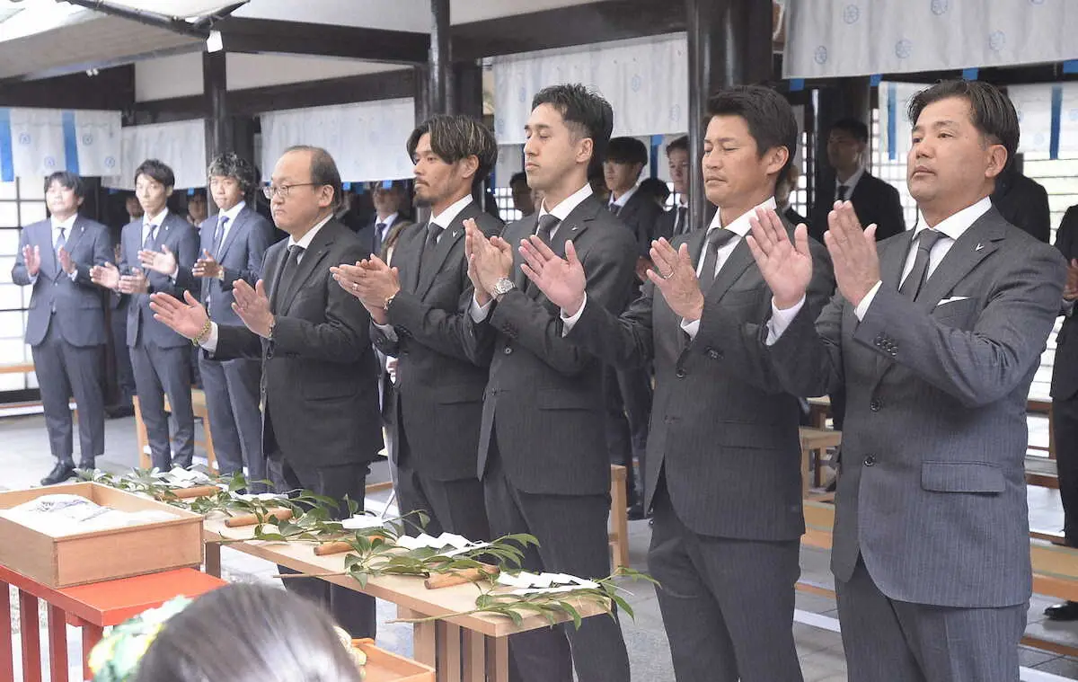 選手、スタッフら約30人がスーツに身を包み、神妙な面持ちで祈祷を受けた。