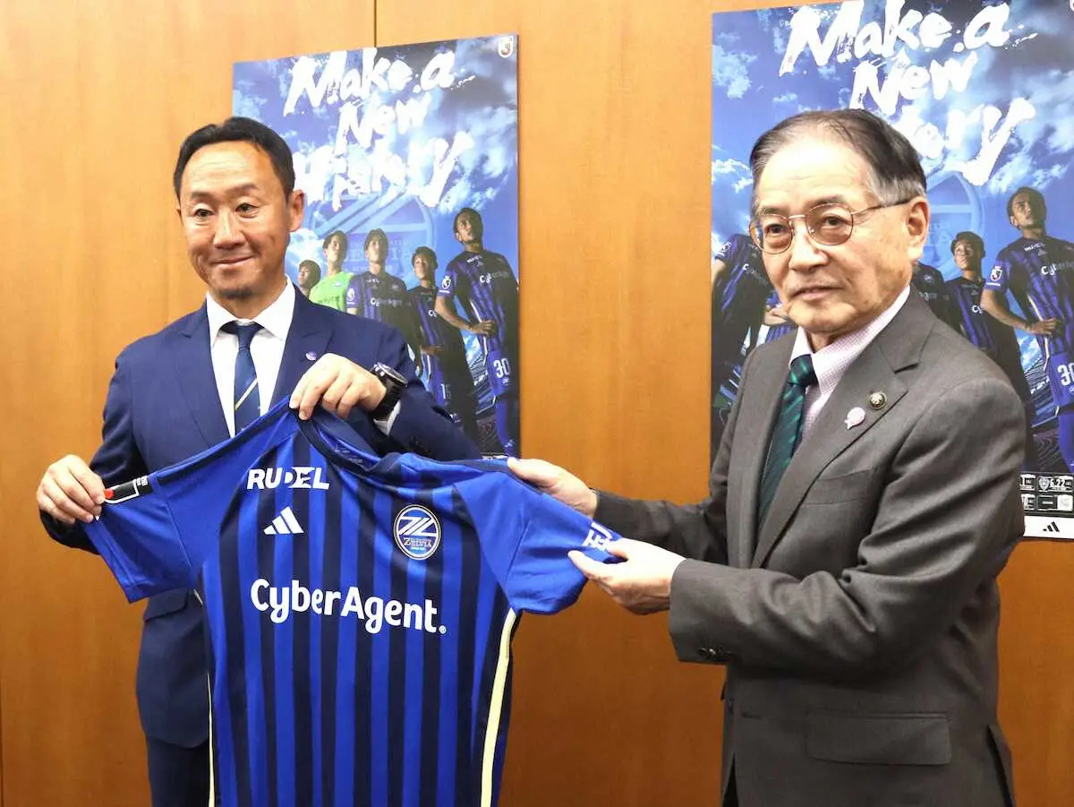 チームを昨季J1昇格とJ2優勝に導いた黒田監督が、石阪丈一市長にユニホームを贈呈。ホームにG大阪を迎えて24日に開幕する国内最高峰のリーグで「チャレンジャー精神で頑張ります。町田市の方々にぜひスタジアムに足を運び、我々の背中を押していただきたい」と来場を呼びかけた。