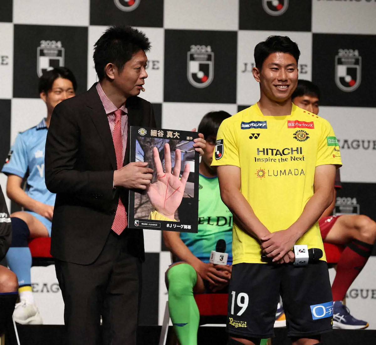 柏のパリ五輪世代のエースの日本代表FW細谷真大(まお、22)が19日、今シーズンの目標に得点王を掲げた。この日に東京都内で開催されたJリーグ開幕PRイベントにチームの代表として出席。ゲストとして参加した手相芸人として知られるお笑い芸人の島田秀平から「素晴らしい手相。まずは中央の縦線、運命性という線がしっかり入っている。ずばり言わせていたくと、今年何かの賞を獲るのではないか」と指摘されると、「あまり信じてないですけど」と周囲の笑いを誘いながらも「得点王?もちろんそこは狙ってます」ときっぱりと話した。