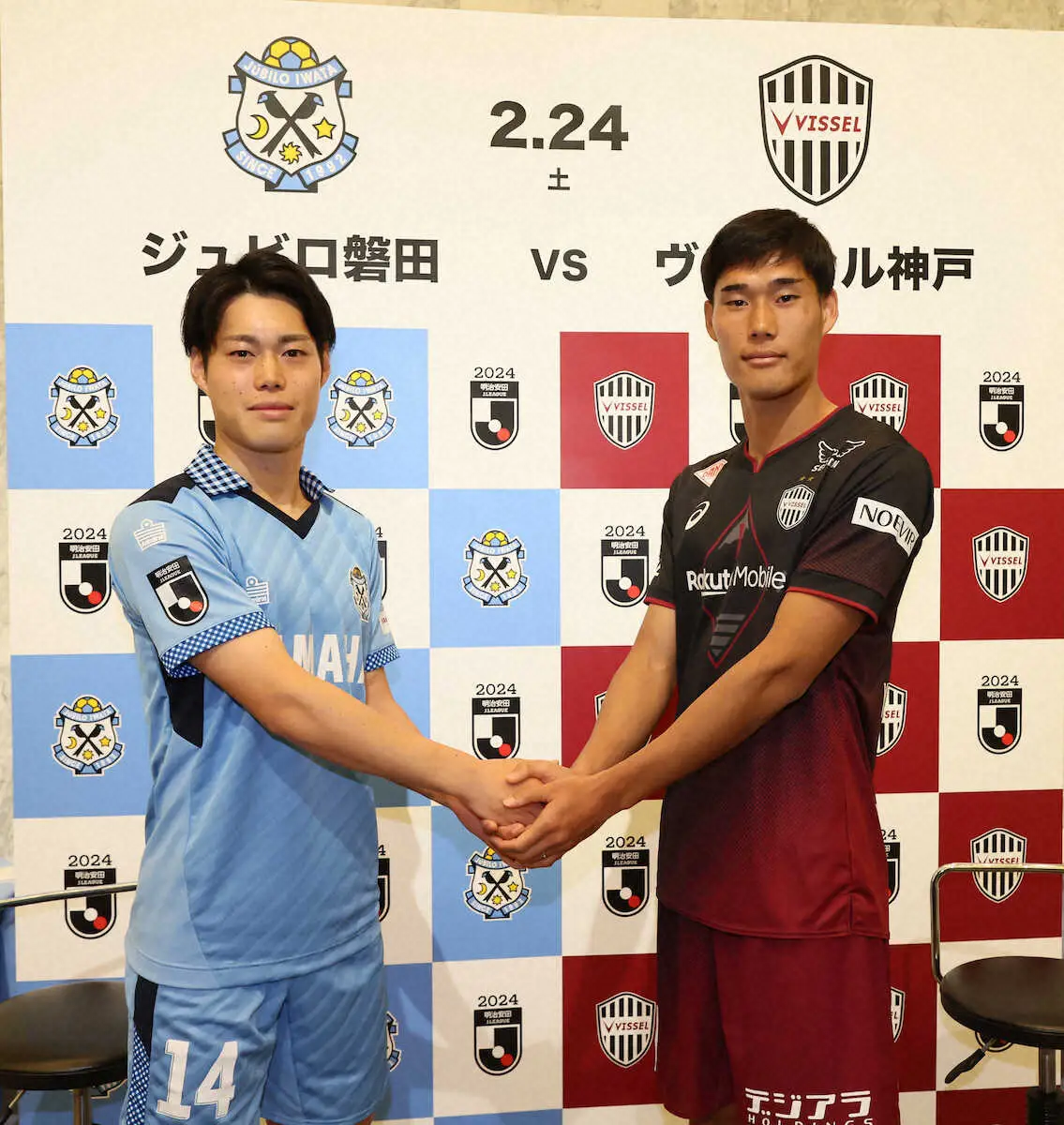 <2024 Jリーグ開幕PRイベント>健闘を誓いあう神戸・山川(右)と磐田・松本 (撮影・西海健太郎)