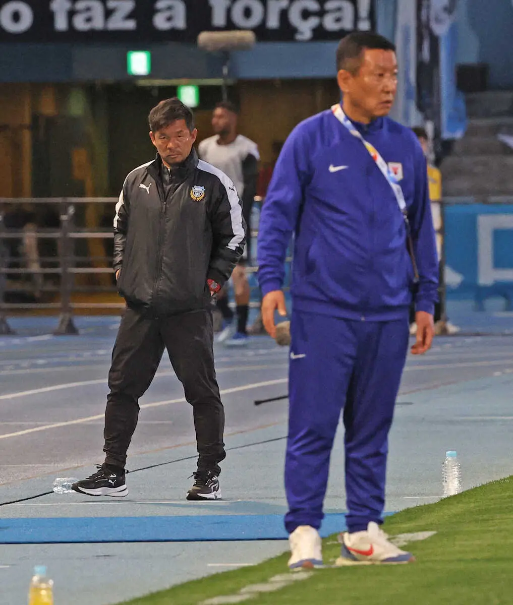 <ACL 川崎F・山東>前半、真剣な表情で試合を見つめる鬼木監督(右は山東のチェ・ガンヒ監督)(撮影・西海健太郎)