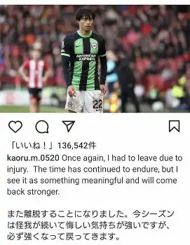 三笘「強くなって戻ってきます」 腰の負傷で今季絶望 インスタで胸中語る