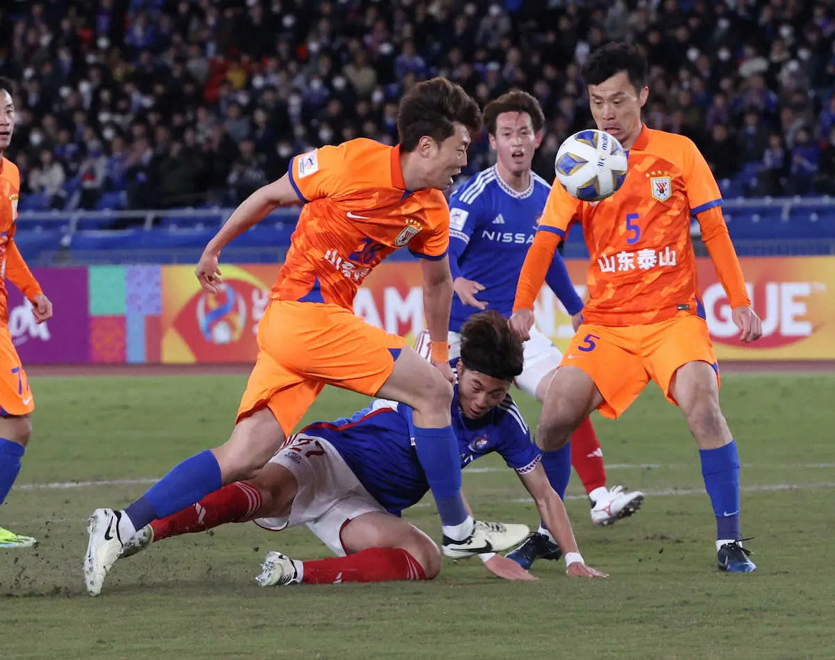 <ACL 横浜・山東>前半、倒される横浜・松原(中)(撮影・西海健太郎)