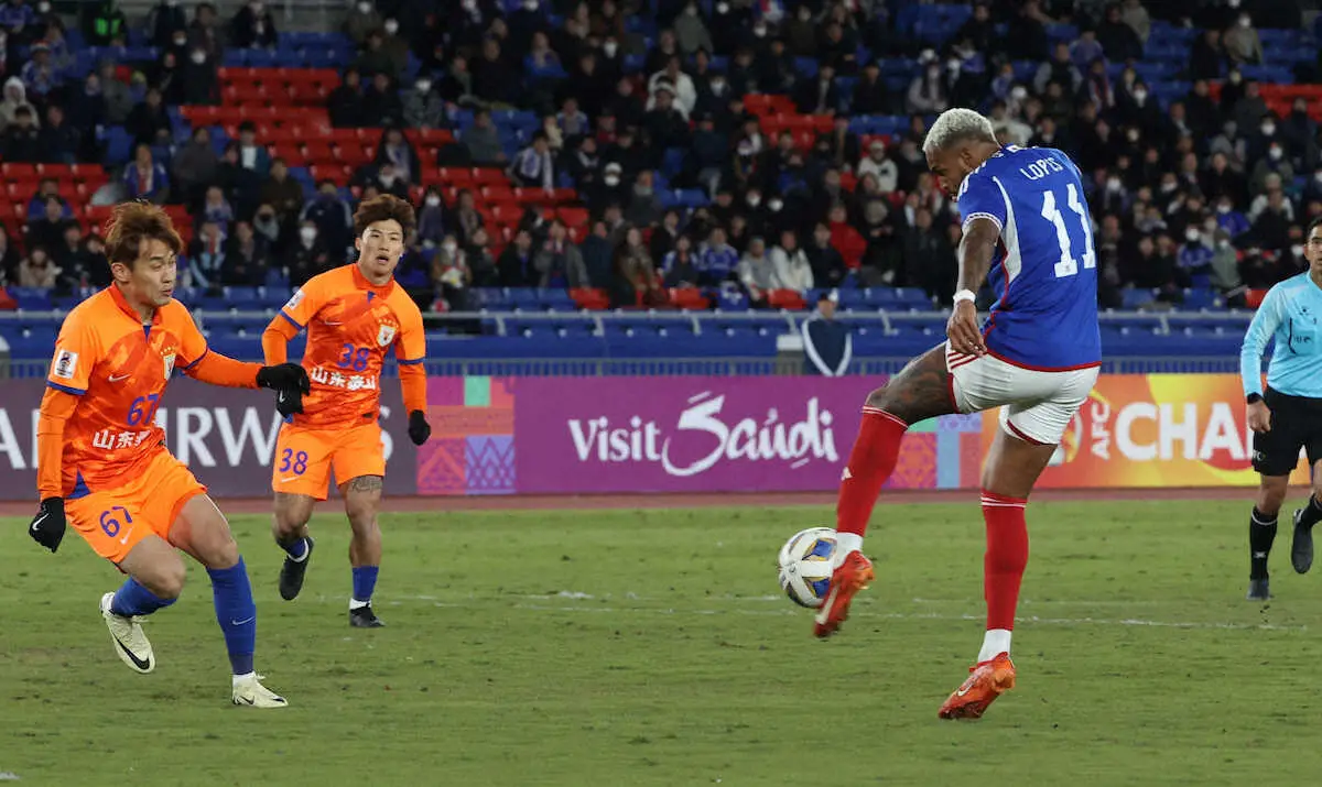 <ACL 横浜・山東>後半、ゴールを決める横浜・アンデルソン・ロペス(撮影・西海健太郎)