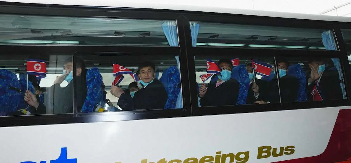 選手と関係者は水色のマスクを着用し、スーツ姿で来日。乗車したバスでは北朝鮮の国旗を持って手をふる選手の姿もあった。