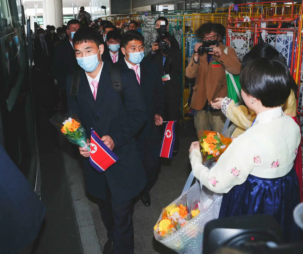 到着した選手らがロビーを1列で進むと「マンセー(万歳)」「アンニョンハシムニカ(こんにちは)」と歓声が上がった。出迎えには在日本朝鮮人総連合会(朝鮮総連)の幹部が参加したほか、若者の姿も目立った。