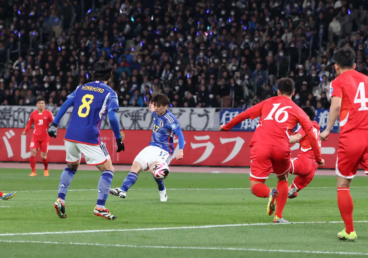 <日本・北朝鮮>前半、田中(左から2人目)が先制ゴール決め、喜ぶ日本代表イレブン(撮影・小海途 良幹) Photo by スポニチ 日本代表 北朝鮮戦開始2分でMF田中碧が先制ゴール!元旦タイ戦以来通算8点目 ギャラリーで見る この記事のフォト 2024年03月21日の画像一覧 もっと見る 2024年03月21日の画像をもっと見る