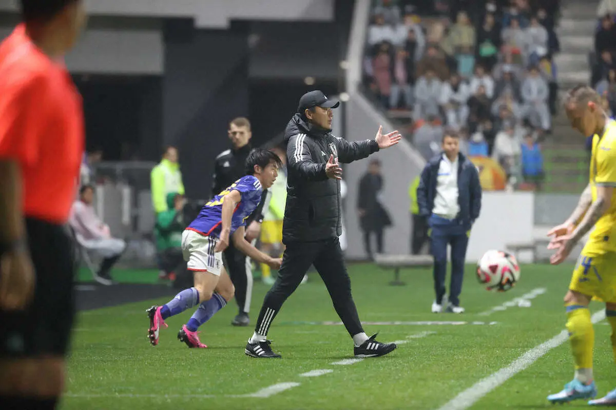 <U-23日本代表・U-23ウクライナ代表>後半、ピッチサイドで指示を出す大岩監督(撮影・小海途 良幹)
