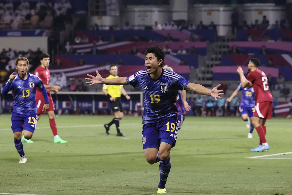 <U-23日本代表・U-23カタール代表>延長前半、勝ち越しゴールを決め、走り出す細谷(撮影・小海途 良幹)