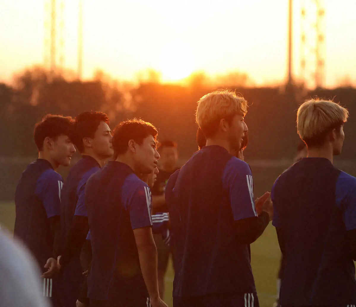 <U-23日本代表練習>夕日に照らされる(左から)佐藤、内野貴、細谷、関根(撮影・小海途 良幹)