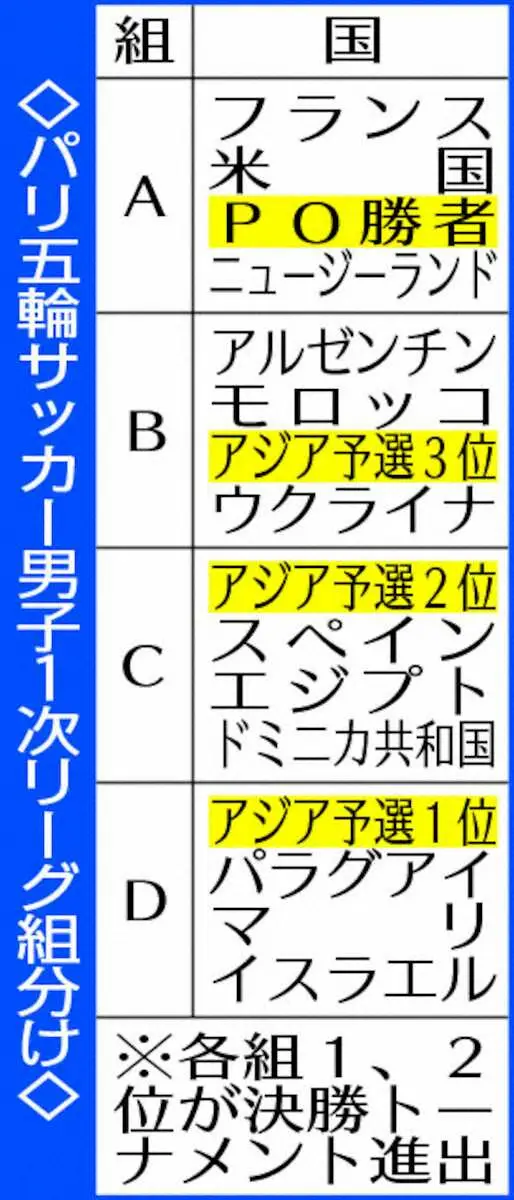 組み合わせ抽選が行われた先月20日の時点では、前回の東京五輪でアジア最上位だった日本が出場権を獲得した場合、最終予選の順位に関係なく、D組に入るとされていたが、この変更で今大会の最終順位の重要性が増すことになった。