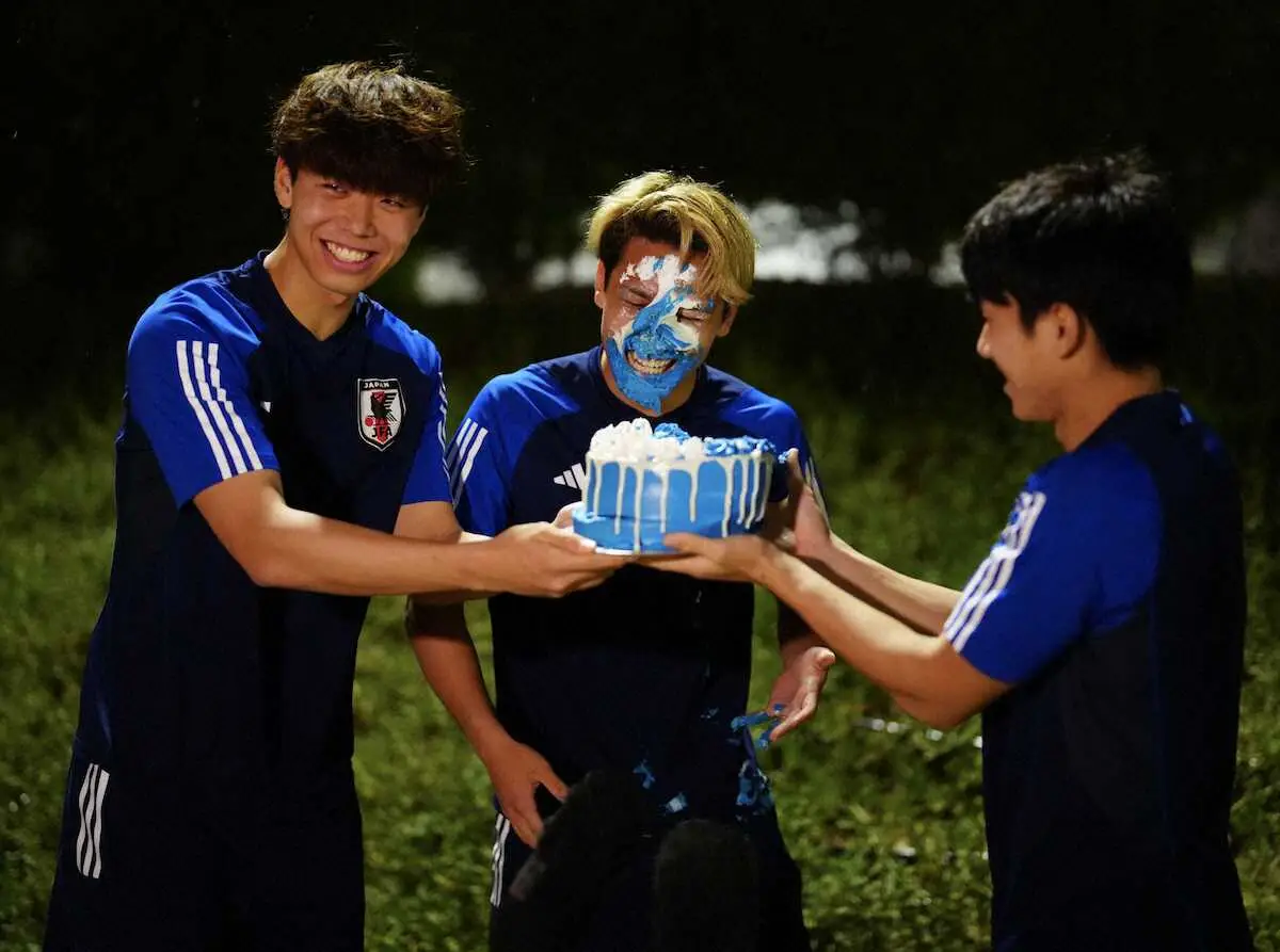 取材対応中にはバースデーケーキが用意され、DF高井幸大(19=川崎F)とMF平河悠(23=町田)から手渡されると、満面の笑み。顔面にクリームを塗られる手荒い祝福も受け「甘い!」と笑っていた。