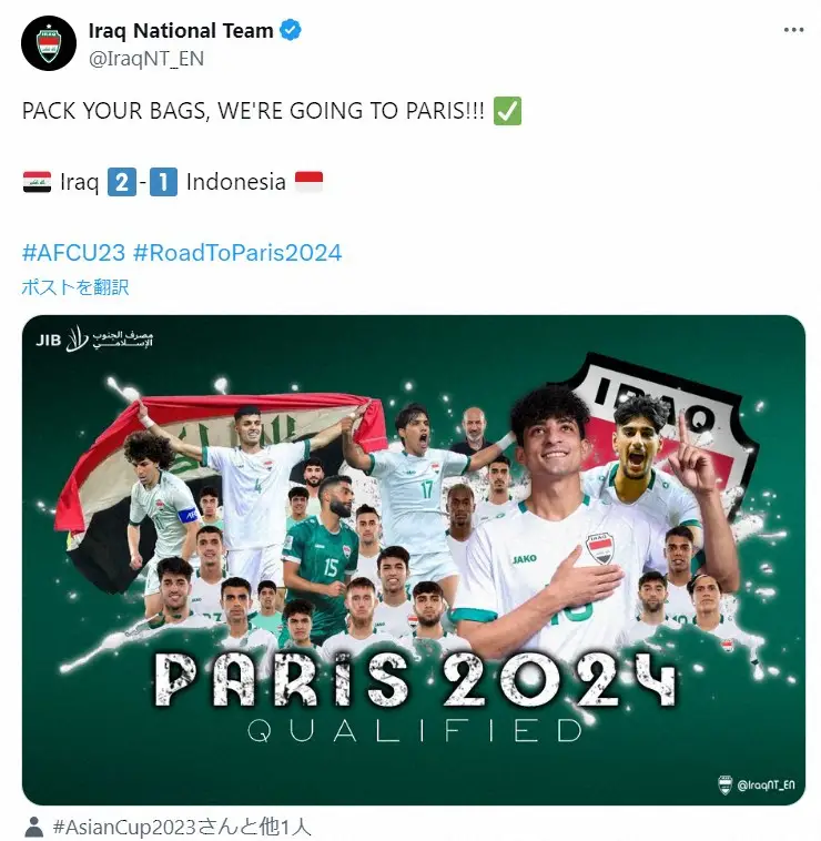 【五輪最終予選】イラク 延長戦でインドネシア下し2大会連続切符!パリ五輪ではアルゼンチンなどと同組に