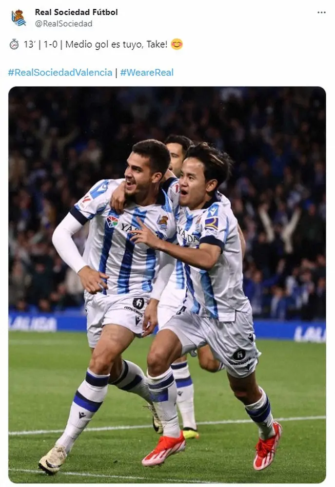 レアル・ソシエダード公式X(@RealSociedad)から。「ゴールの半分は君ものだ、タケ!!」と久保のアシストを絶賛