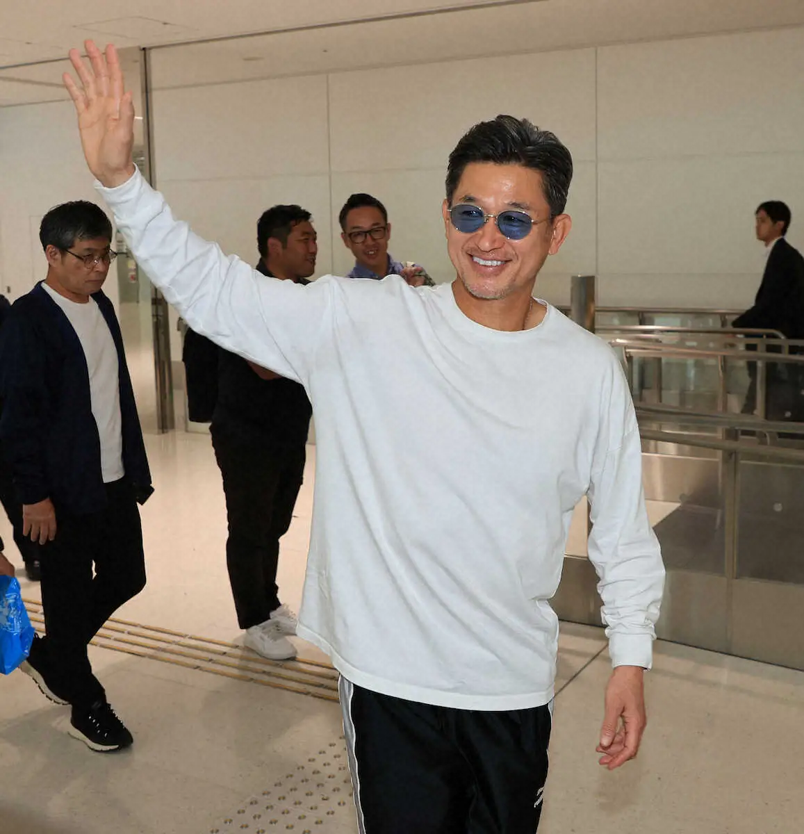 <三浦知良帰国>ポルトガルから帰国、囲み取材を終えて笑顔で手を振る三浦知良(撮影・篠原岳夫)