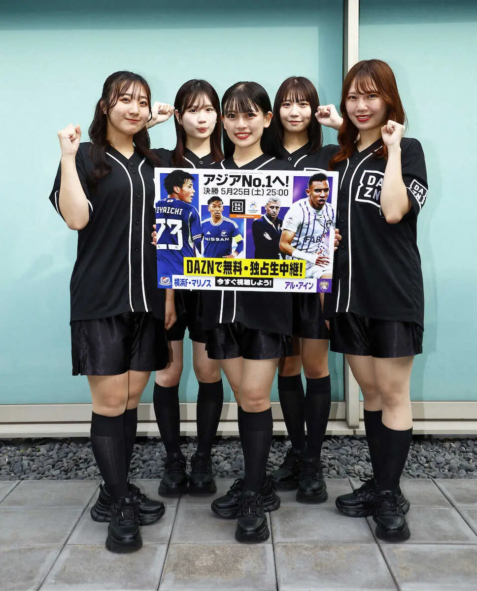 スポーツコンテンツの現場でリポート&インタビュー活動を行う「DAZNガールズ」の5人(SHION、MAO、MOMO、MONA、KIMIKA)が23日、東京・越中島のスポーツニッポン新聞社を訪問。ACLを独占配信するスポーツ・チャンネル「DAZN(ダゾーン)」が、ACL決勝第2戦を「DAZN Freemium」で無料配信することをPRした。