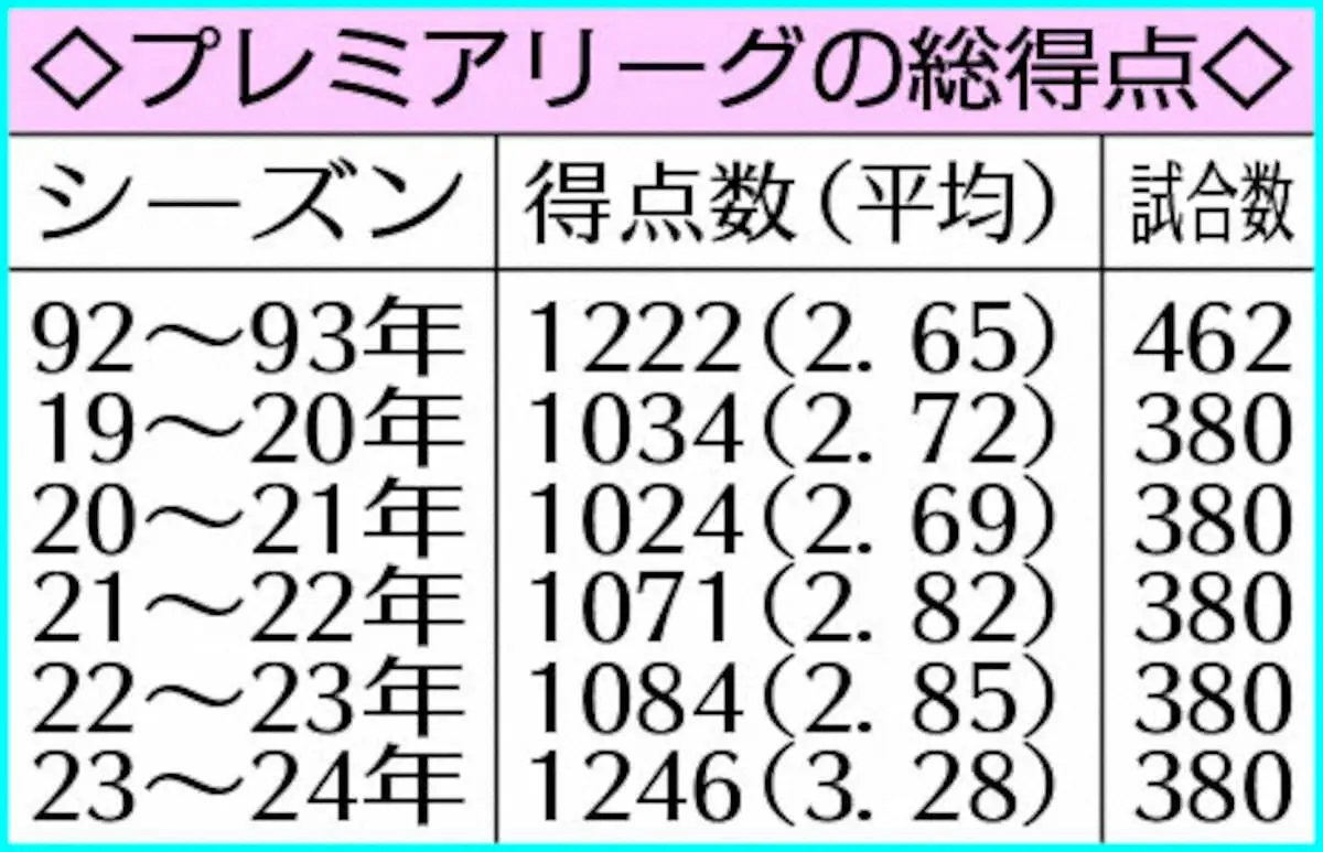 戦術も得失点増の要因だ。リスク覚悟で果敢に攻めるポステコグルー監督のトットナムは17試合で得失点合計4点以上の乱打戦を記録。堅守のオニール前監督から攻撃的スタイルで知られたイラオラ監督に今季切り替えたボーンマスは得失点を昨季の108から121に増やした。76歳で保守的なホジソン前監督の下で1試合平均の得失点が2・92だったクリスタルパレスは、2月にグラスナー監督が就任すると3・21に数字が上昇。バーンリーのコンパニー監督ら下位にも攻撃志向が強い指揮官がそろった。