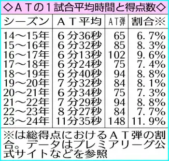 22年W杯カタール大会でFIFAは試合で浪費された時間を厳密にATに加算。「長過ぎる」と話題になった。プレミアリーグも今季から続いたことでATが劇的に増加。1試合平均で昨季よりも3分8秒も長い11分35秒になった。試合時間が延びればゴールも増える。今季は148点がATに記録され、実に全体の11・9%。昨季の84点(7・7%)を大幅に上回った。
