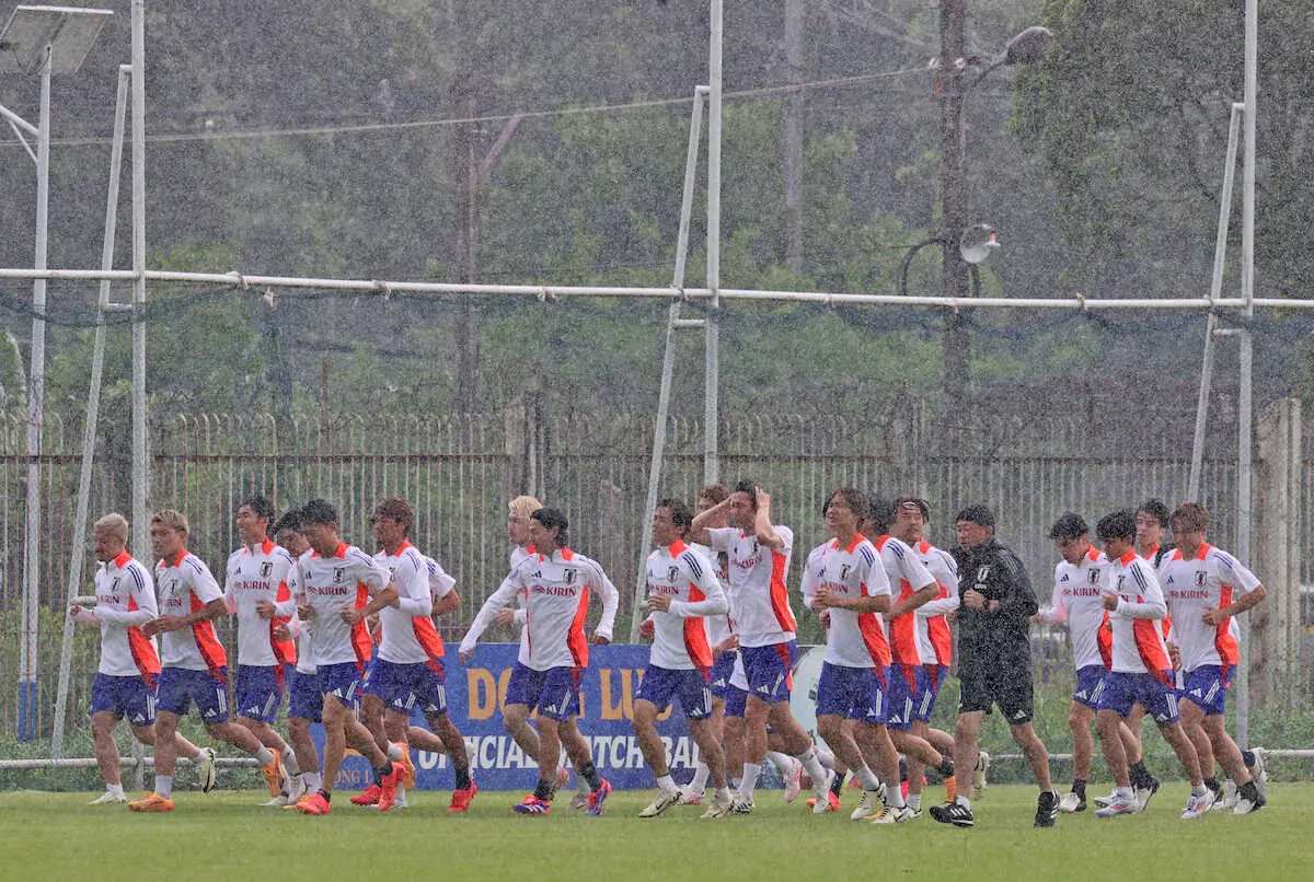 <サッカー日本代表練習>いきなりアウエーの洗礼・・練習開始とともに降り出した大雨の中、走る久保(右から3人目)らイレブン(撮影・西海健太郎)