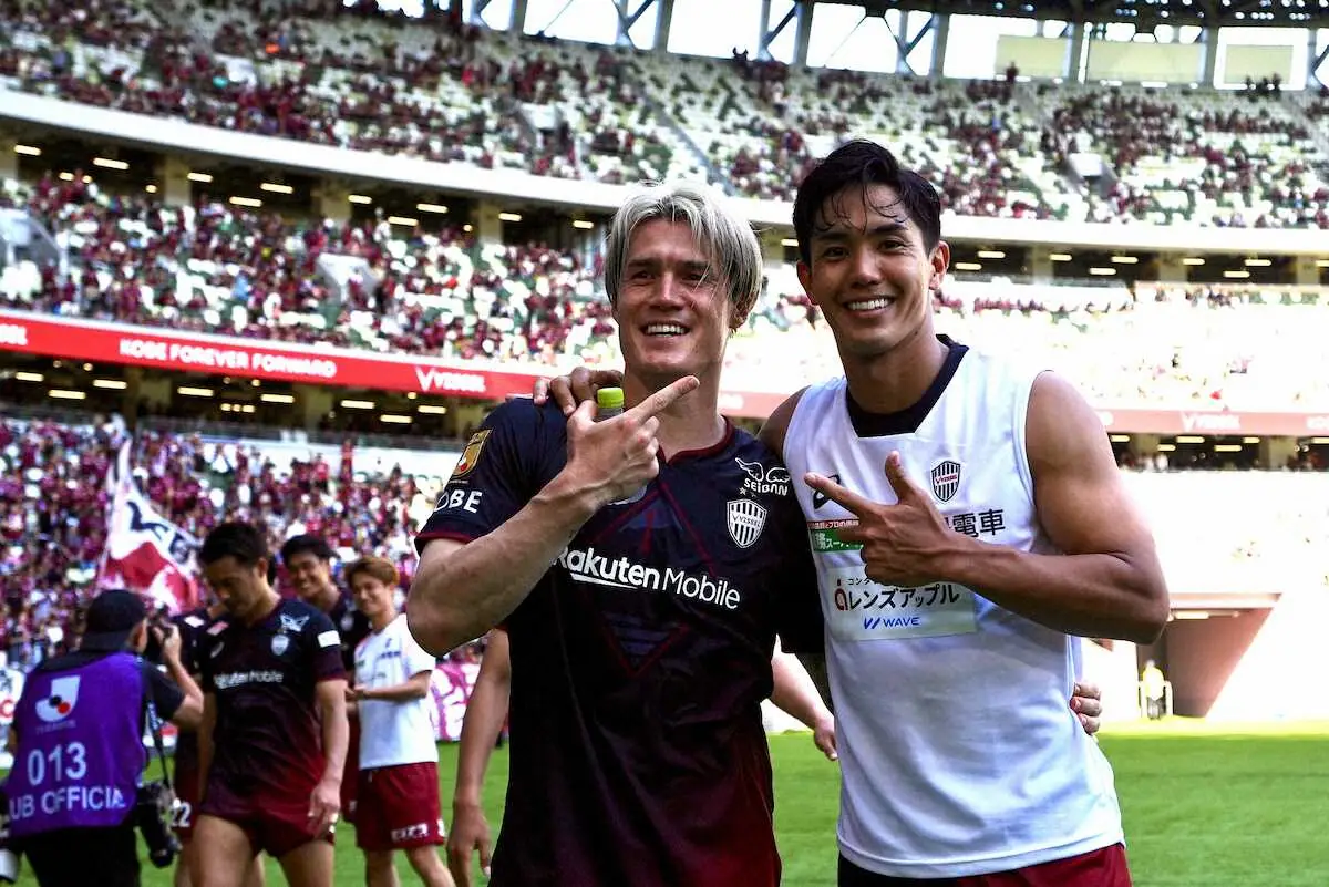 <神戸・川崎F>川崎Fに勝利し酒井(左)と笑顔を見せる武藤(撮影・会津 智海)