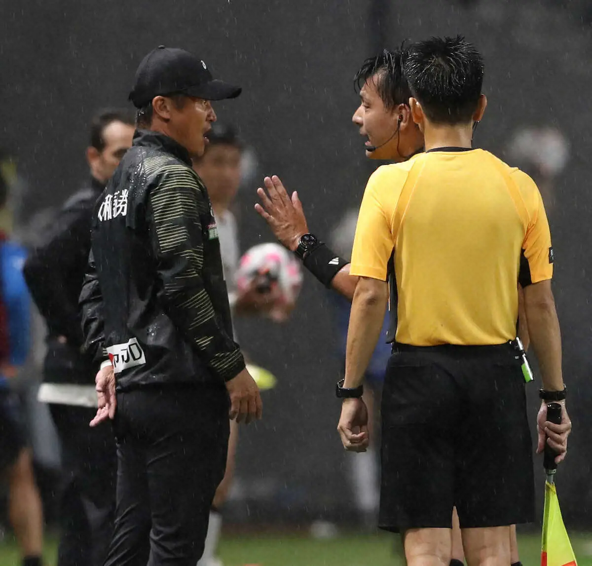 判定を巡って審判と話す神戸の吉田監督。上位対決で痛恨の黒星を喫した(撮影・長嶋 久樹)