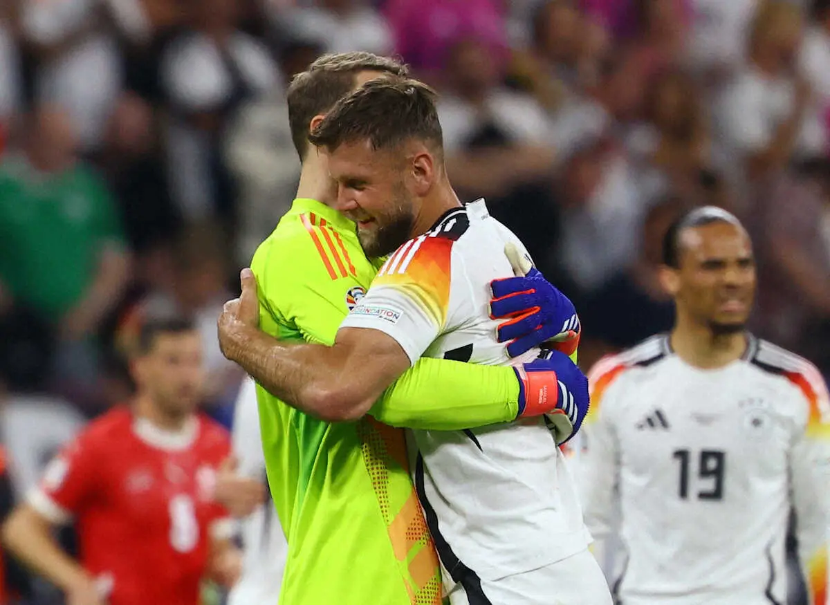 <欧州選手権 スイス・ドイツ>ドローで首位通過が決まり、喜ぶドイツ代表フュルクルク(右)とノイアー(中央)ら(ロイター) 劇的同点弾呼んだ!ドイツ代表GKノイアー“神セーブ”をネット絶賛「やっぱり… ギャラリーで見る この記事のフォト 2024年06月24日の画像一覧 もっと見る 2024年06月24日の画像をもっと見る