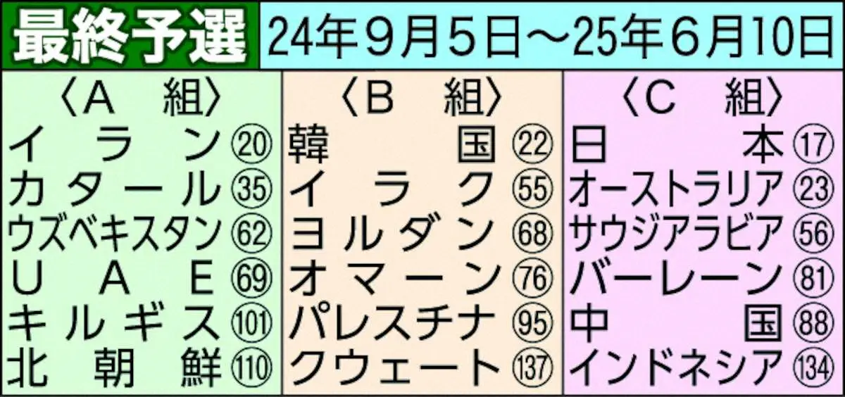 今回からアジアの本大会出場枠が4・5→8・5に増加。9月開幕の最終予選は18チームが3組に分かれホーム&アウェーで争われ、各組2位までが出場権を獲得。3、4位の計6チームが2組に分かれてアジア・プレーオフを戦い、各1位がW杯出場を勝ち取り、2位同士のアジア9位決定戦を制したチームが大陸間プレーオフに進む。