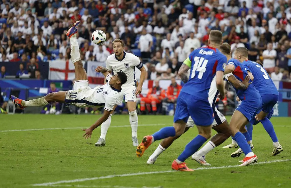 サッカーの24年欧州選手権(EURO)ドイツ大会決勝トーナメント1回戦、悲願の初優勝を狙うイングランド(C組1位)がスロバキア(E組3位)に劇的な逆転勝利。1点リードを許し敗戦濃厚だった後半アディッショナルタイム、FWジュード・ベリンガム(21=Rマドリード)が圧巻のバイシクルシュートで同点ゴール。1―1となって今大会初の延長戦に突入すると延長前半1分、主将のFWハリー・ケーン(30=Bミュンヘン)が逆転ゴールを決め120分の激闘を2―1で制し、2大会連続の8強進出を果たした。