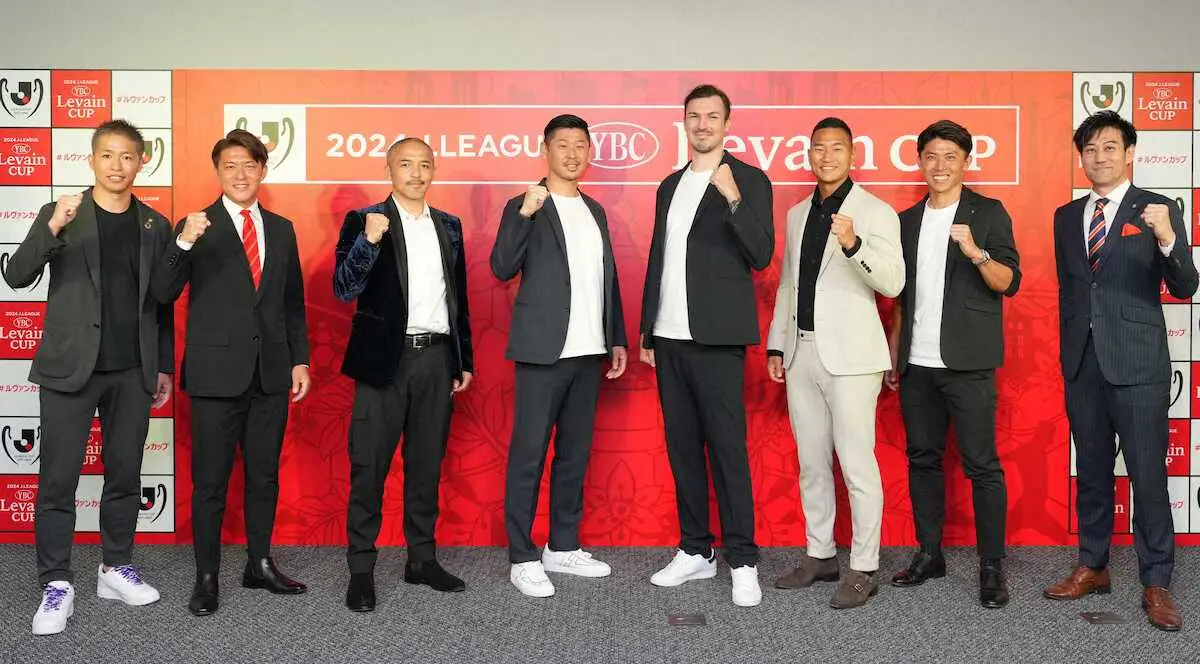 ルヴァン杯プライムラウンド抽選会に参加した各クラブOB。左から広島・森崎浩司氏、名古屋・田中隼磨氏、札幌・小野伸二氏、横浜・栗原勇蔵氏、甲府・ハーフナーマイク氏、川崎F・鄭大世氏、町田・太田宏介氏、新潟・野沢洋輔氏(Jリーグ提供)