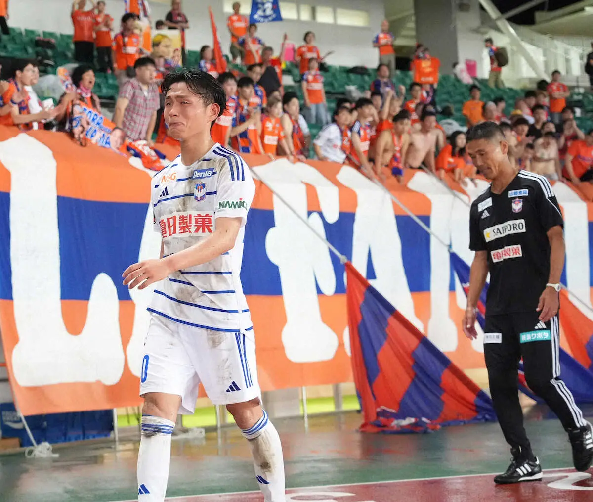 まさかの大量6失点。新潟は前半から守備でもろさを見せ、天皇杯で“てっぺん”を目指す戦いは終わった。試合後、後半アディショナルタイムに意地のゴールを決めたMF石山の目には涙があふれ、松橋監督も珍しく選手らとともにサポーターの元に足を運んだ。