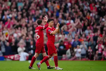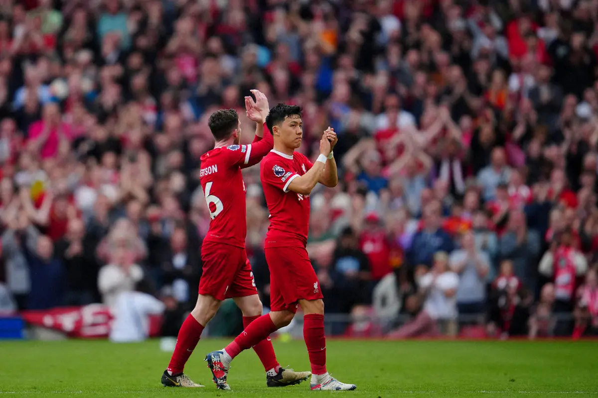本拠アンフィールドでファンの声援に応えるリバプール・遠藤(右)(AP)