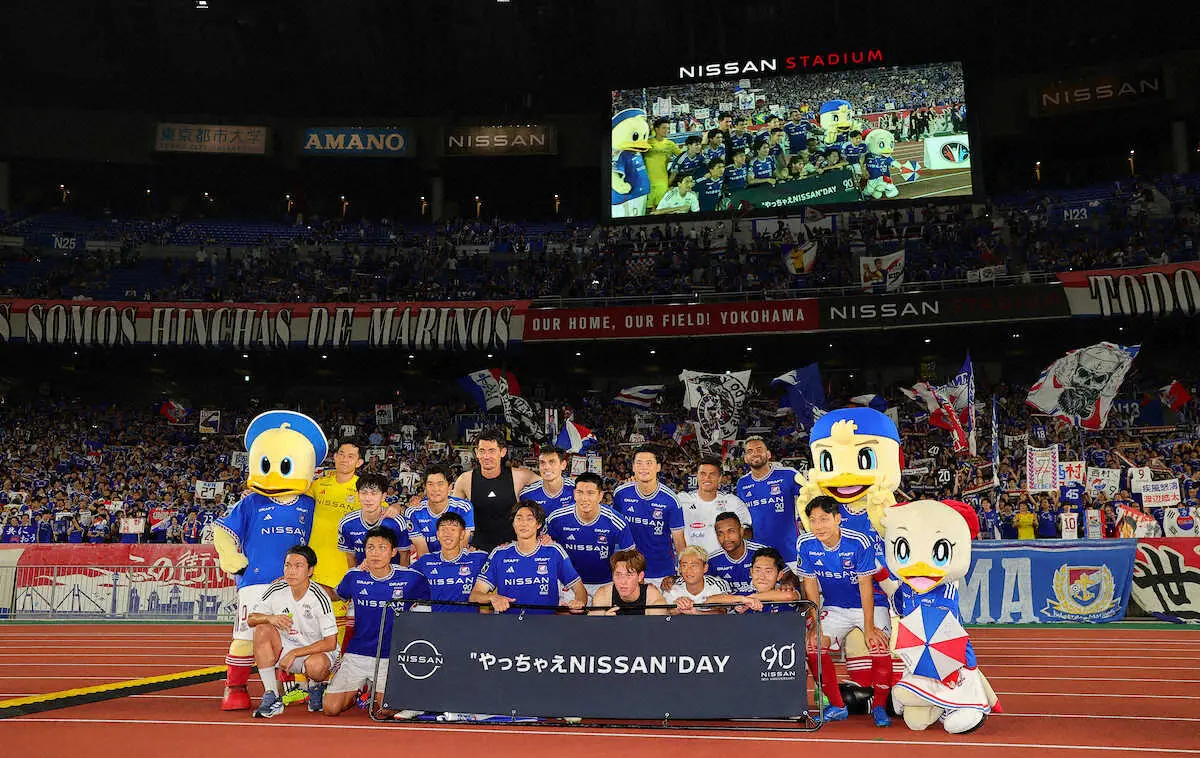 <横浜・鹿島>勝利し、記念撮影する横浜イレブン(撮影・光山 貴大)