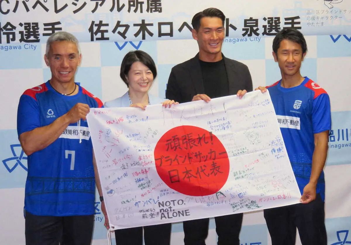 視覚障がい者らによるブラインドサッカーでパリ・パラリンピックに出場する日本代表に選ばれた品川CCパペレシアルの川村怜(35)と佐々木ロベルト泉(46)が17日、品川CCサッカー部門のトップチーム監督を務める槙野智章氏(37)と品川区役所を表敬訪問した。