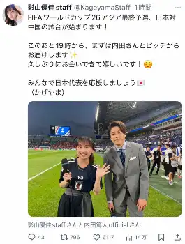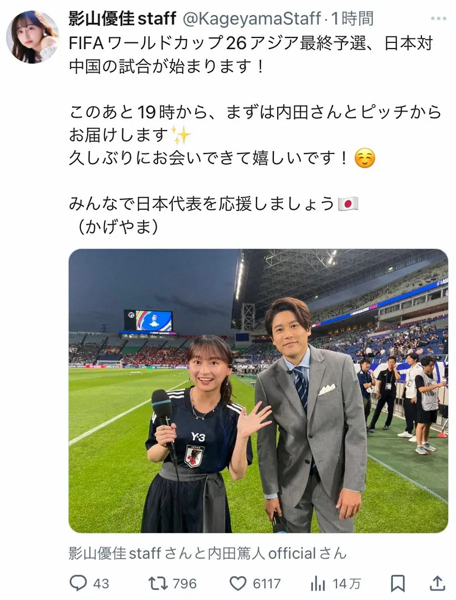 テレビ朝日系の中継では、熱狂的なサッカーファンで知られる元日向坂46で女優の影山優佳(23)がゲスト出演。解説を務める元日本代表の内山篤人氏と、試合前にピッチサイドからリポートした。