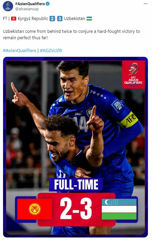 A組はウズベキスタンが敵地でキルギス(同102位)との接戦を3―2と制し、開幕2連勝。初のW杯切符獲得へ好スタートを決めた。同組ではイランも敵地でUAE(同69位)を1―0で撃破し、開幕2連勝。勝ち点6でウズベキスタンとならぶも得点数の差で2位につけた。