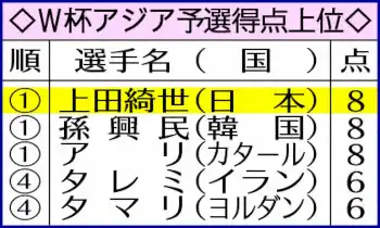 ≪キングはカズ&岡崎≫日本選手のW杯アジア予選得点王は94年米国大会予選の三浦知良が13得点(1次9、最終4)、14年ブラジル大会予選の岡崎慎司が8得点(3次5、最終3)で記録している。なお、日本選手の1大会最多は98年フランス大会予選の三浦知良で14得点(1次10、最終4)。