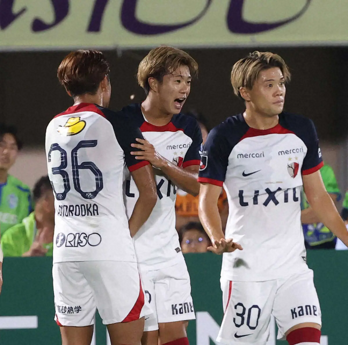 <湘南・鹿島>前半、この日自身1得点目のゴールを決め喜ぶ鹿島・濃野(中)(撮影・西海健太郎)