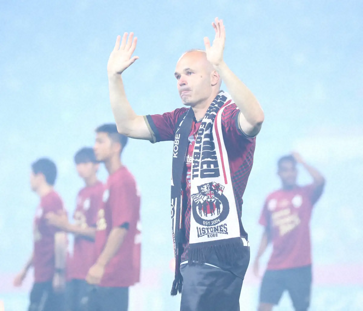 23年、神戸退団セレモニーでファンの声援に応えるイニエスタ