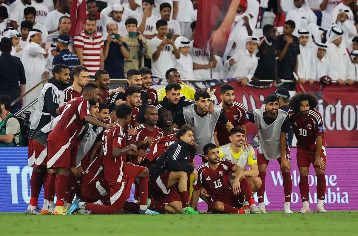 キルギスを下しW杯アジア最終予選初勝利を挙げ、記念撮影するカタール代表イレブン(ロイター)