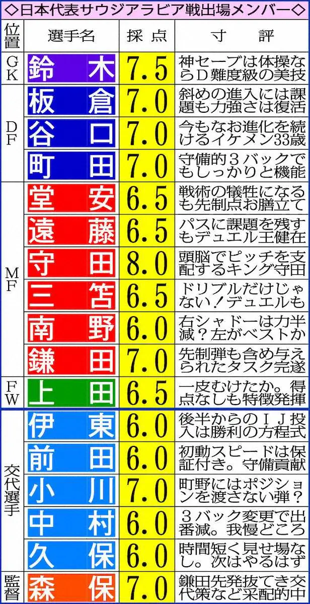 【ズバッと採点CHECK 垣内一之】日本のプライド、勝利へのこだわり、執念が存分に発揮された試合だった。それを象徴するシーンが、人気漫画キャプテン翼で、日向小次郎率いる明和が南葛の大空翼に対して繰り出した「スライディング部隊」をほうふつさせた前半27分のシュートブロック。守田、遠藤ら4選手が決死のダイブでシュートを阻止。勝ちたい気持ちを前面に押し出した。