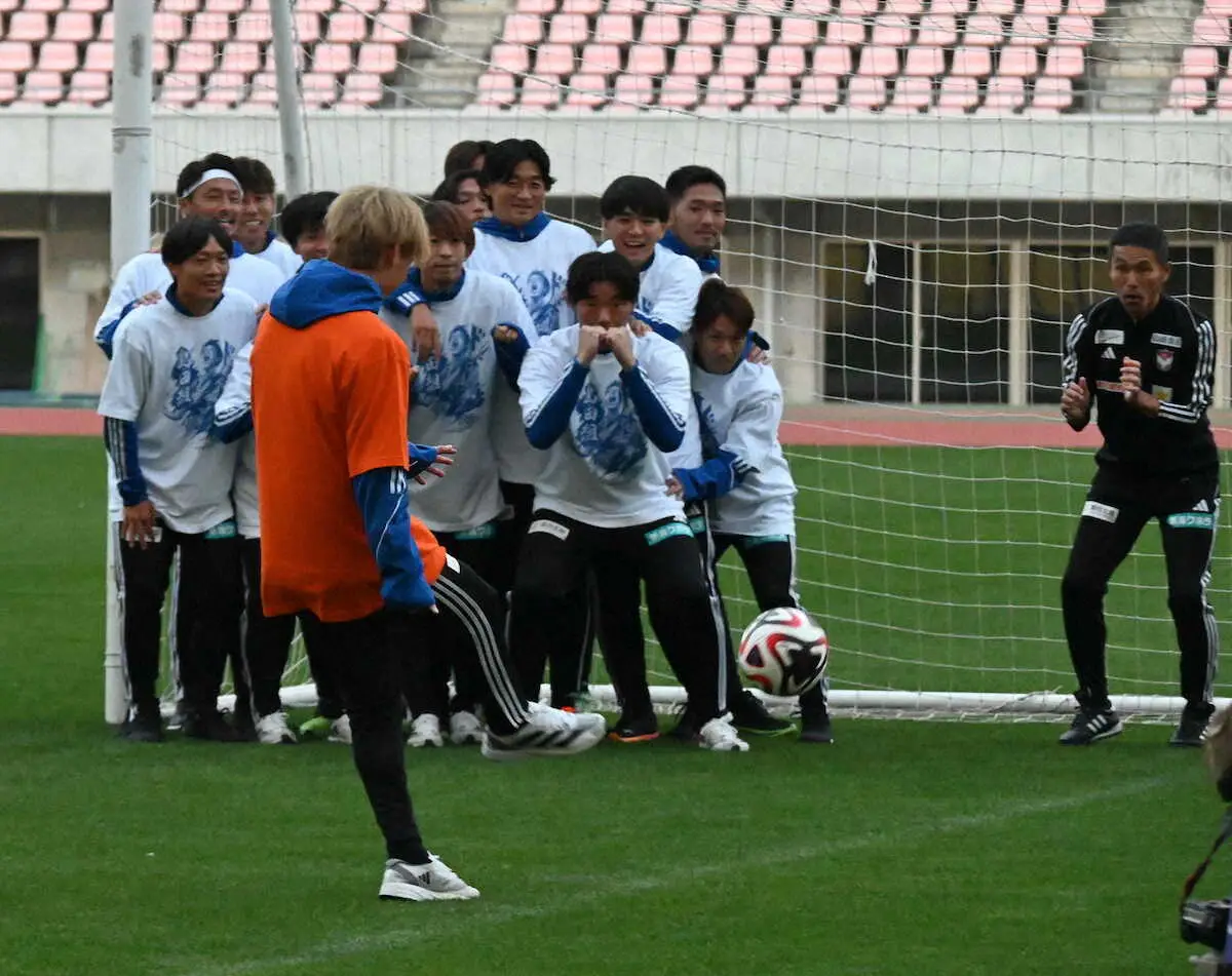 実は事前に選手たちが企画したもので、松橋監督がボールをセット。1本目は促されて決勝のPK戦と同じく右に蹴り、ポストに直撃したが、やり直しの2本目はきっちりと決めた。