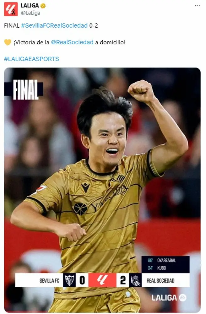 サッカー・スペイン1部公式X(@LaLiga)から。久保の得点によりRソシエダードが勝利したことを伝えた