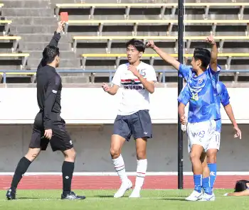 新鋭と伝統校、我慢の100分間だった。前半11分、抜け出したAIE国際・池内を止めようと滝川第二・浜口がペナルティエリアの外でファウル。決定的な得点機会の阻止で一発退場となり早々に10人での勝負を余儀なくされた。