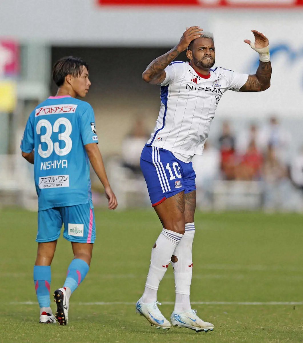 <鳥栖―横浜>後半、チーム2点目のゴールを決め、喜ぶ横浜のアンデルソンロペス(右)